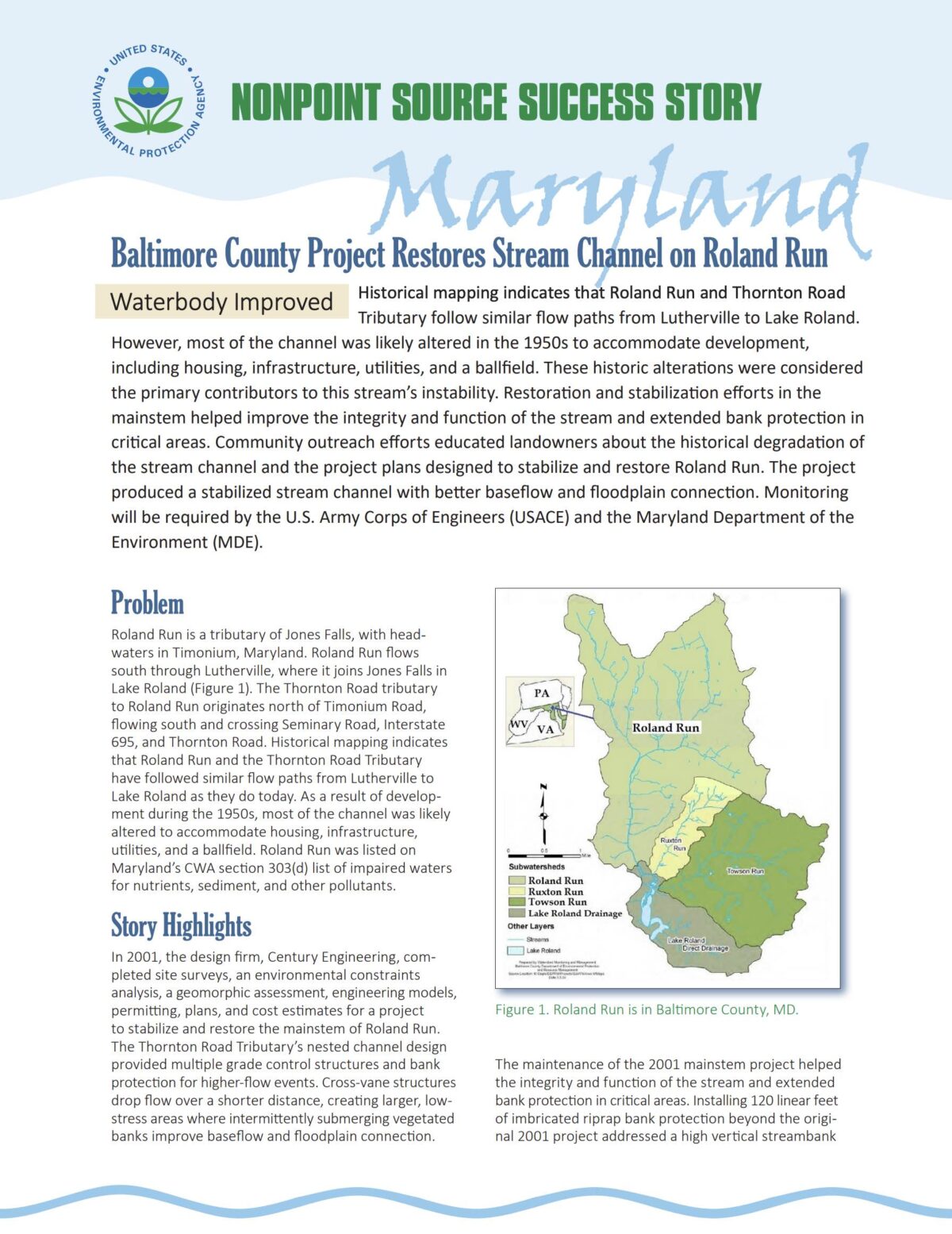 United States Environment and Protection Agency Report: Baltimore County Project Restores Stream Channel on the Roland Run General Information View Full Article PDF Screenshot Screenshot
